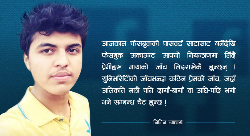 शिवजीको पालामा भन्दा अहिले परीक्षाको शैली फेरिएको छ । आजकाल फेसबुकको पासवर्ड साटासाट गर्नेदेखि फेसबुक अकाउन्ट आफ्नो नियन्त्रणमा लिँदै प्रेमीहरु मायाको जाँच लिइराखेकै हुन्छन् । फेसबुके फेसन भनेको यही हो कि !
