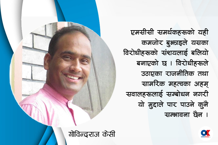 एमसीसी समर्थकहरूको यही कमजोर बुझाइले यसका विरोधीहरूको संशयलाई बलियो बनाएको छ। विरोधीहरूले उठाएका राजनीतिक तथा सामरिक महत्वका अहम् सवालहरूलाई सम्बोधन नगरी यो मुद्दाले पार पाउने कुनै सम्भावना छैन।