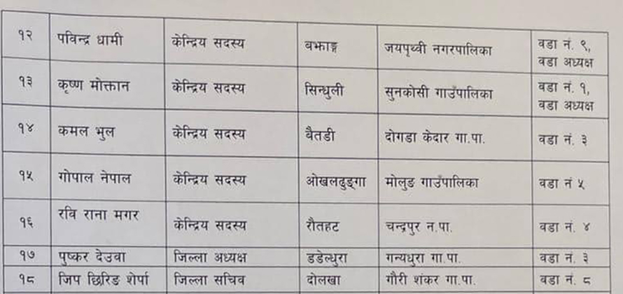१. भुपेन्द्र कट्टेल– केन्दीय प्रतिनिधि