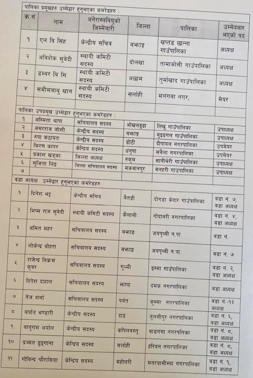 त्यस्तै एकीकृत समाजवादीको विद्यार्थी संगठन अनेरास्ववियूका ३ जनाले पालिका प्रमुख/अध्यक्षमा उम्मेदवारी दिएका छन् । उपप्रमुख/उपाध्यक्षमा उम्मेदवारी दिने पनि ३ जना नै रहेका छन् ।