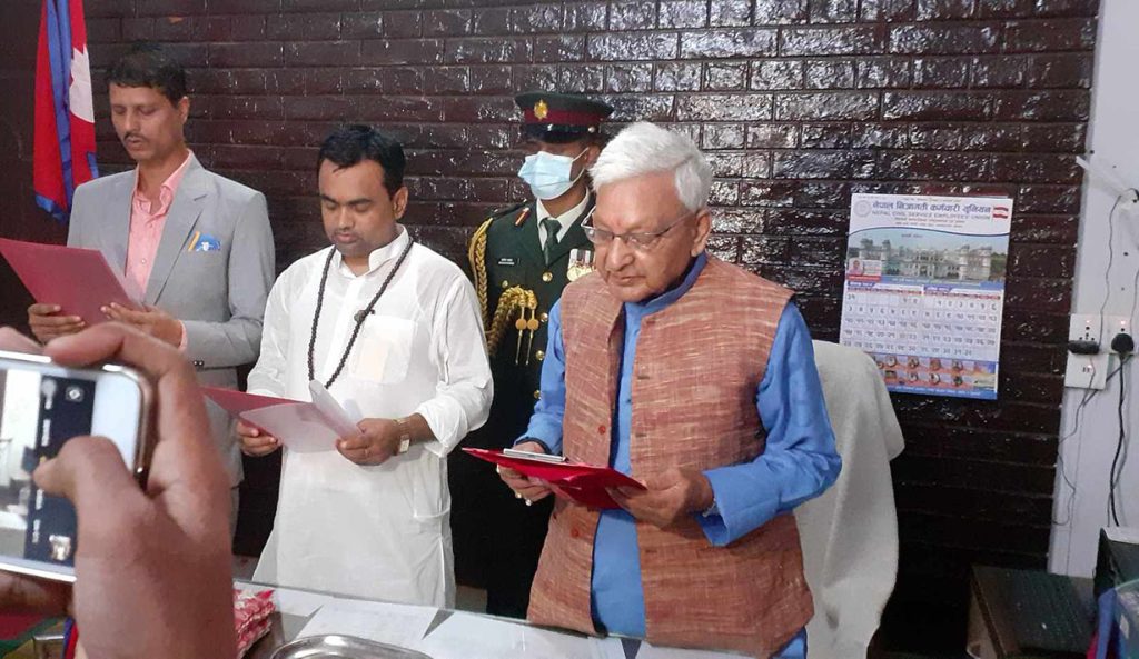 नवनियुक्त मन्त्रीहरु मोहम्मद समिम र चन्दन सिंह शपथ लिँदै ।