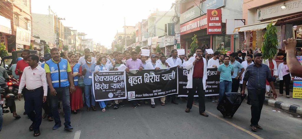 नेपाल चिकित्सक संघ जनकपुर अञ्चल शाखाको नेतृत्वमा चिकित्क तथा स्वास्थ्यकर्मीले प्रदर्शन गर्दै कुटपिट घटनामा संलग्नहरुमाथि कडा कारबाहीको माग गरेका छन् ।
