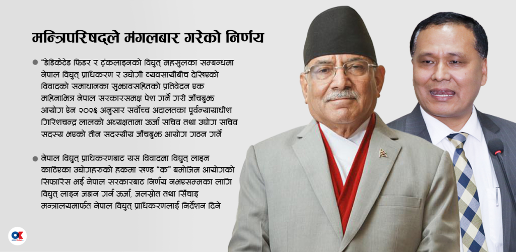 मन्त्रिपरिषद्को मंगलबारको बैठकले सर्वोच्च अदालतका पूर्वन्यायाधीश गिरिशचन्द्र लालको अध्यक्षतामा डेडिकेटेड र ट्रंक लाइन विवाद समाधानका लागि आयोग बनाउने र त्यस आयोगको सिफारिस बमोजिम निर्णय नहुञ्जेलका लागि २४ उद्योगमा काटिएको लाइन जोड्न निर्देशन दिने निर्णय गरेको थियो ।