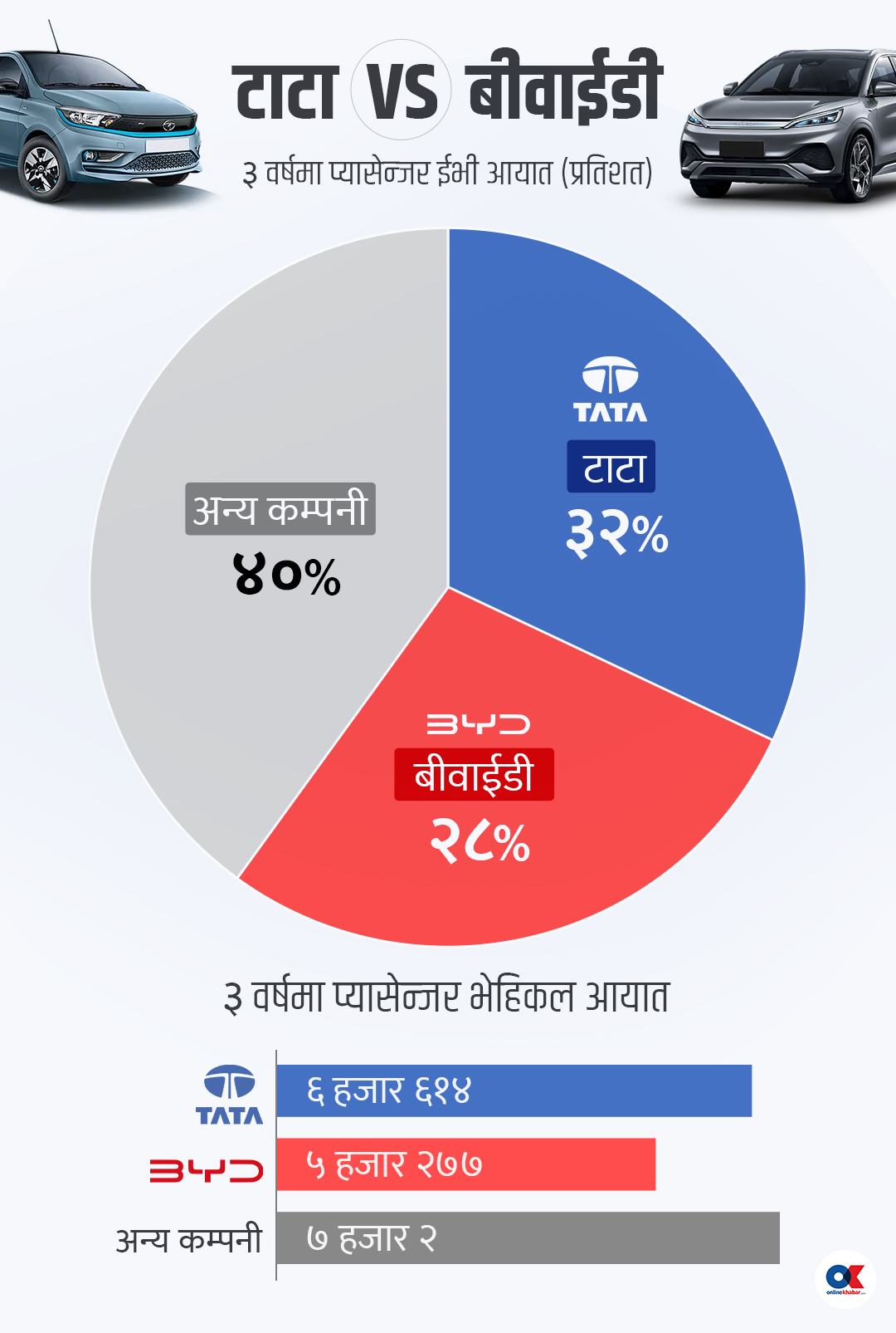 व्यवसायीहरूकै शब्दमा अहिले नेपाली सडकमा भारतीय र चिनियाँ कम्पनीका विद्युतीय सवारी बीच 'ब्याटल' नै छ । पछिल्लो तथ्याङ्क अनुसार चिनियाँ उत्पादनले बाजी मारिरहेका छन् । कुल ईभीमा चीनको हिस्सा ५८.३६ प्रतिशत छ भने भारतको ३६.१२ प्रतिशत ।