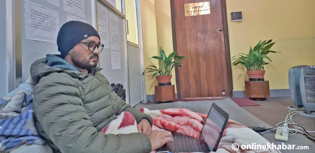 ४ पुस, काठमाडौं । त्रिविका स्ववियु सचिव सिद्धान्त भट्ट ३५ बुँदे माग राखेर २४ सै घण्टा उपकुलपति प्राडा केसरजंग बरालको कार्यकक्ष अगाडि ढोकामा बसेको ९ दिन भयो । उनी धर्ना बसेकै ठाउँमा साथीहरूले खाना ल्याइदिन्छन् र राति पनि सँगै बस्छन् ।