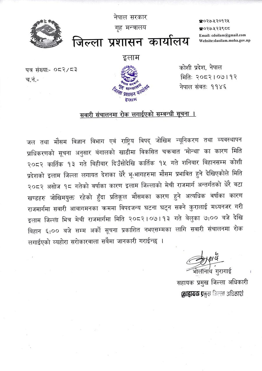 १२ कात्तिक, विराटनगर । बंगालको खाडीमा विकसित भएको मोन्था चक्रवातको असरबाट हुने जोखिमलाई मध्यनजर राखेर मेची राजमार्गको इलाम खण्डमा बिहीबार राति सवारी चलाउन रोक लगाइएको छ ।