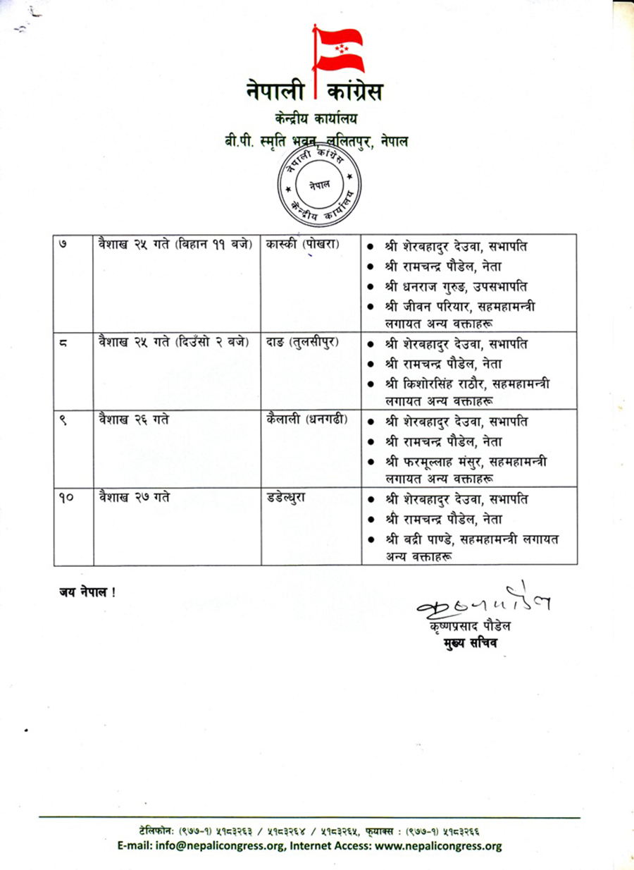 नेपाली कांग्रेस स्थानीय तह निर्वाचन केन्द्रीय परिचालन समितिको निर्णय अनुसार २१ वैशाखमा विराटनगरमा, २२ वैशाखमा चितवनको भरतपुरमा, २३ वैशाखमा काठमाडौंमा, २४ वैशाखमा रुपन्देहीको बुटवलमा, २४ वैशाखमा तनहुँको दमौली र धनुषाको जनकपुरमा, २५ वैशाखमा कास्कीको पोखरा र दाङको तुलसीपुरमा, २६ वैशाखमा कैलालको धनगढीमा र २७ वैशाखमा डडेलधुरामा चुनावी सभा आयोजना हुने भएको हो ।