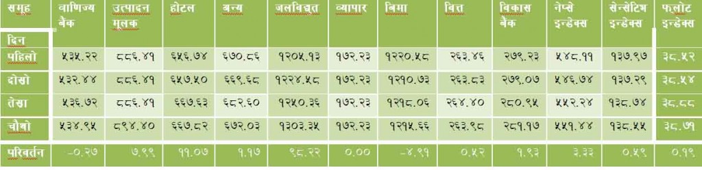 यस साता नेपाल स्टक एक्सचेन्जमा १३१ कम्पनीहरुको कारोबार भएको छ, जस अनुसार ८२३४ कारोबारबाट ८७ करोड २१ लाख ९७ हजार रुपैयाँ बराबरका २६ लाख २१ हजार ९ सय १७ कित्ता शेयरहरु खरीद बिक्री भएका छन् । गत साता १२७ कम्पनीहरुको कारोबार भएको थियो, जस अनुसार ६०७४ कारोबारबाट ६३ करोड ४५ लाख ८१ हजार रुपैयाँ बराबरका २७ लाख ९ हजार ३ सय २ कित्ता शेयरहरु खरीद बिक्री भएका थिए ।