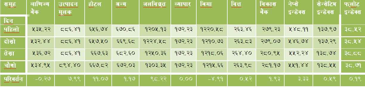 १४ भदौ, काठमाडौं । साताको नेप्से परिसूचक पहिलो दिनको तुलनामा ३.३३ अंकले वृद्धि भई अन्तिम दिन ५५१.४४ अंकमा पुगेको छ । ‘क’ वर्गका कम्पनीको कारोबार मापन गर्ने सेन्सेटिभ इन्डेक्स पहिलो दिनको तुलनामा ०.५९ अंकले वृद्धि भई १३८.४४ अंकमा आइपुगेको छ ।