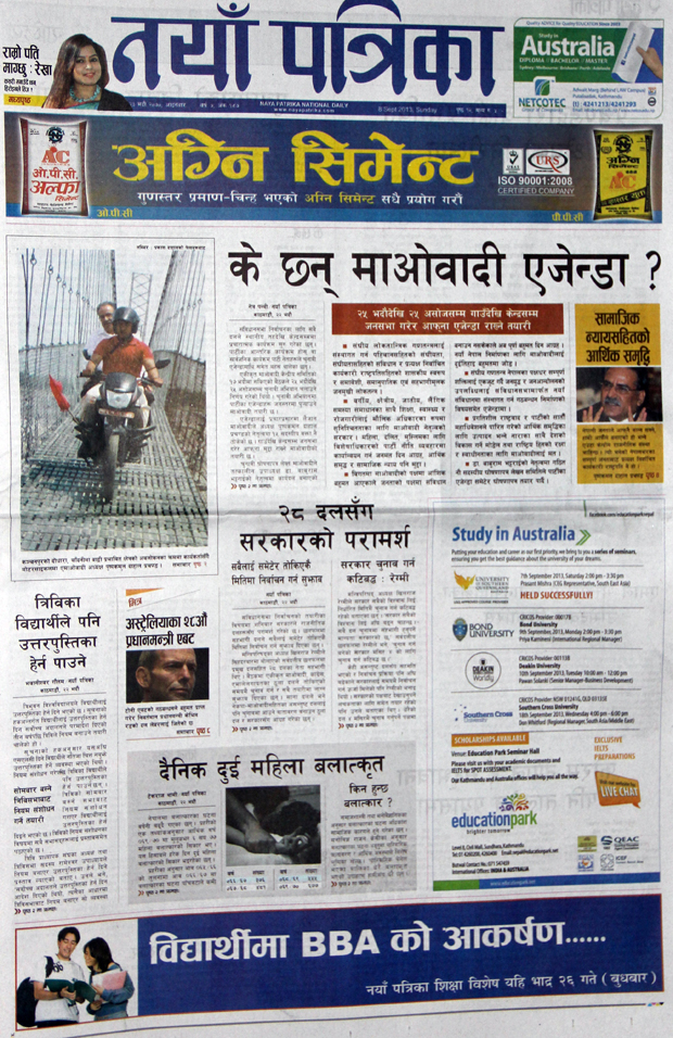 आज मिति २०७० भदौ २३ गते आइतबार । राजधानीबाट प्रकाशित आजका दैनिक पत्रिकाले छोराको हत्यारालाई पक्राउ गरी कारबाही गर्न मागगर्दै ४७ दिनदेखि अनसनमा बसेका नन्दलाल र गंगामाया अधिकारीले अनसन तोडेको खबरलाई प्राथमिकताका साथ छापेका छन् ।