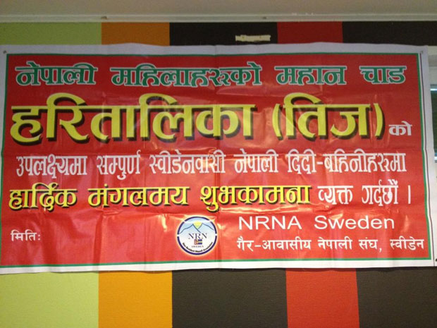 स्टकहोल्म । नेपाली नारीहरूको महान पर्व हरितालिका तीज स्विडेनमा पनि भव्यताका साथ मनाइएको छ । एनआरएनए स्विडेनको आयोजनामा आइतबारका स्विडेनको राजधानी स्टकहोल्ममा भब्य तरिकाले तीज पर्ब मनाइएको हो । एन.आर.एन.ए. स्विडेनका अध्यक्ष नबिन थपलियाको मन्तब्यबाट औपचारिक रुपमा सुरु भएको कार्यक्रममा उपस्थित सम्पूर्ण चेलीहरुले धक फुकाई कम्मर मर्काई मर्काई नाचे गाए र रमाइलो गरे ।