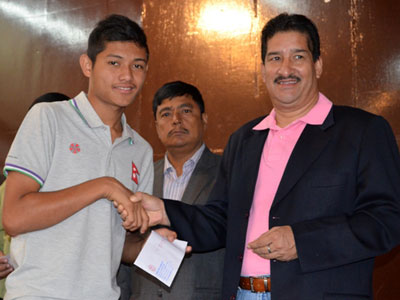 एएफसी यू-१६ च्याम्पियनससिपको फाइनल चरणमा पुगेको नेपाली टोलीका कप्तान विमल घर्तीमगरलाई नगदसहित सम्मान गर्दै एन्फा अध्यक्ष गणेश थापा । तस्वीर सौजन्यः एन्फा