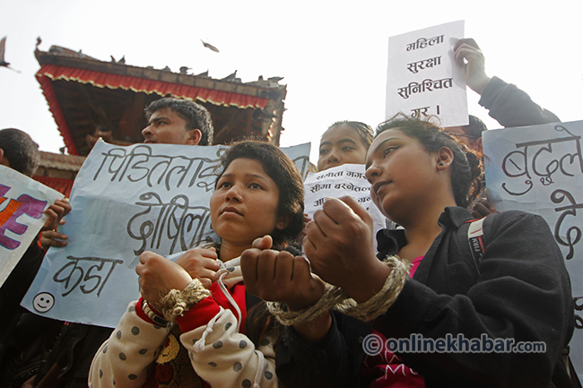 यसैवीच मंगलबार नै काठमाडौंको बसन्तपुरमा महिला अधिकारकर्मीहरुले तेजाव आक्रमणको घटनामा संलग्न दोषीमाथि कारवाहीको माग गर्दै डोरीले हात बाँधेर प्रदर्शन गरेका छन् । निर्णय फाउण्डेसनले बसन्तपुरमा सो प्रदर्शन गरेको हो ।