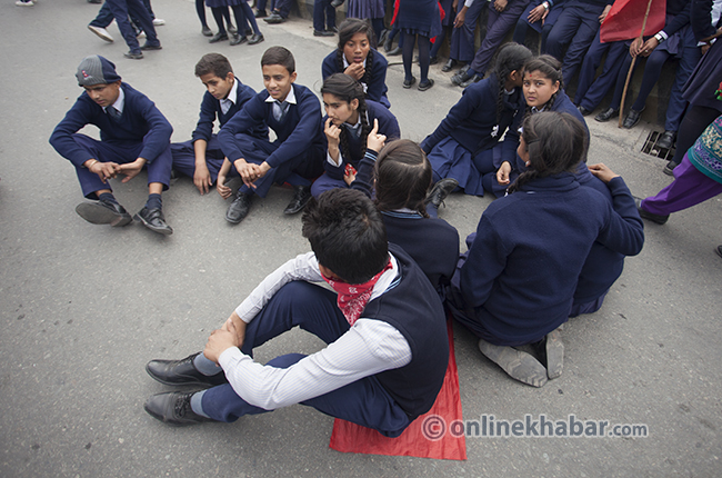 धर्नामा एकाएक विद्यालयकै पोशाकमा स-साना केटाकेटी र किशोर किशोरीहरु देखा परे । उनीहरु कलम र तारा अंकित रातो झण्डामा सजिएका थिए ।
