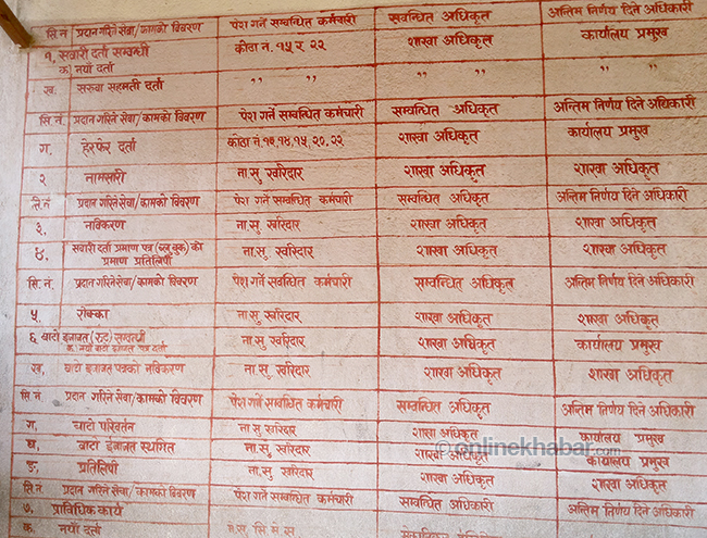 देखाउनलाई त कार्यालयमा नागरिक बडापत्र पनि टाँसिएको छ । १५ मिनेट देखि १ घण्टाको बीचमा सेवाग्राहीका प्रायः सबै काम हुनेछन् भनेर स्पष्ट किटान पनि गरिएको छ । तर, यी त सब भन्ने कुरा हुन् ।