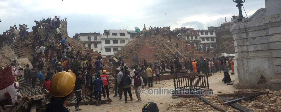 १२ वैशाख, काठमाडौं । शनिबार मध्याहृन आएको विनाशकारी भूकम्पले ठूलो धनजनको क्षति भएको छ । अर्थमन्त्री रामशरण महतले नेपाल आर्मीलाई उदृत गर्दै जनाए अनुसार १ हजार ४ सय ५७ जनाको शव भेटिएको छ । १ हजार ५५ घाइतेको उद्दार गरिएको छ ।