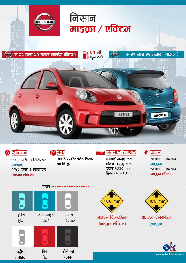 निसानले माइक्रा र माइक्रा एक्टिभ गरि दुईवटा मोडलका गाडी सार्वजनिक गरेको छ । माइक्रा र माइक्रा एक्टिभ दुवैमा दुई-दुई भेरियन्टमा ६ वटा रंगमा गाडी उपलब्ध हुनेछन् ।