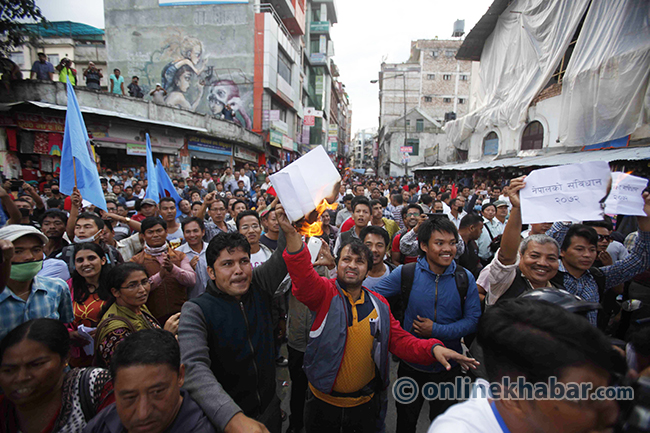 नयाँ संविधान जारी भएको दिन असोज ३ लाई कालो दिनका रुपमा मनाएका असन्तुष्ट दलहरुले सोमबार देशभर संविधान जलाएर विरोध गरेका छन् ।
