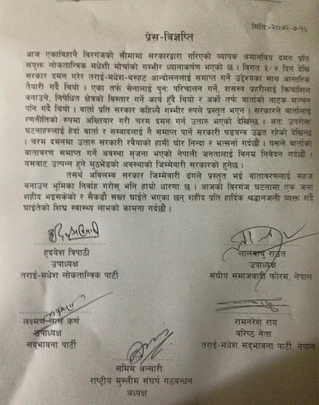 मधेसी मोर्चाले विज्ञप्ति निकालेर सरकार वार्ताप्रति कहिल्यै गम्भीर रुपमा प्रस्तुत नभएको आरोप लगाएको छ । सरकारले वार्तालाई रणनीतिका रुपमा अख्तियार गरी चरम दमन गर्न उत्रिएको देखिन्छ’ मोर्चाले भनेको छ-‘उपरोक्त घटनालाई हेर्दा वार्ता र सम्वाद नै समाप्त वार्ने सरकारी षड्ष्न्त्र उद्धत रहेको देखिन्छ ।’
