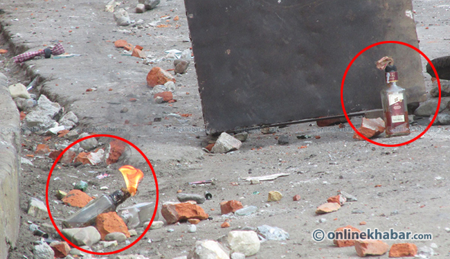 आन्दोलनकारीहरुले सिसाको बोटलमा पेट्रोल राखेर धागो हाल्ने र त्यसमा आगो लगाएर हान्ने गरेका छन् । उनीहरुले ढुंगामुढाका साथै गुलेलीबाट हानेका थिए ।