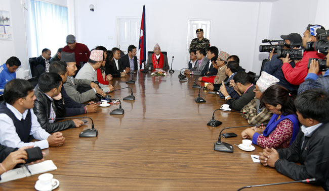 २० कात्तिक, काठमाडौं । प्रधानमन्त्री केपी शर्मा ओली बुधबार बिहान सिंहदरबारमा पत्रकारहरुसित गम्भीर मुद्रामा प्रस्तुत भए । आफूलाई भेट्न आएका पत्रकार महासंघका प्रतिनिधिहरुमाझ उनले भारतीय नाकाबन्दीका सन्दर्भमा निकै खुलस्त विचार राखे । उनले आफू मुखमात्रै चलाएर नबसेको स्पष्ट पारे ।