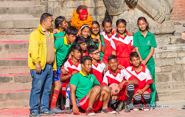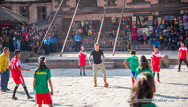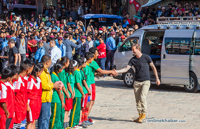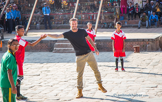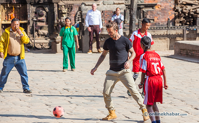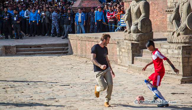 बेकहमले पद्मा उच्च माध्यमिक विद्यालयका विद्यार्थीहरुसँग केहीबेर फुटबल खेल । इटा ओछ्याइएको मैदान भएपछि विद्यार्थीहरु बेकहृयामसँग निकै रमाएर फुटबल खेलेका थिए ।