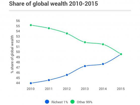सन् २०१३ मा विश्वभर ३८८ जना धनी मानिसहरुसँग दुनियाको आधा श्रोत साधन तथा सम्पत्ति थियो । त्यसयता धनीहरुको संख्यामा लगातार गिरावट आयो । सन् २०१४ मा दुनियाको आधा सम्पत्तिका मालिक केवल ८० जना मात्र धनाढ्य थिए । त्यो संख्या अझै घटेर सन् २०१५ मा ६२ मा झरेको छ ।