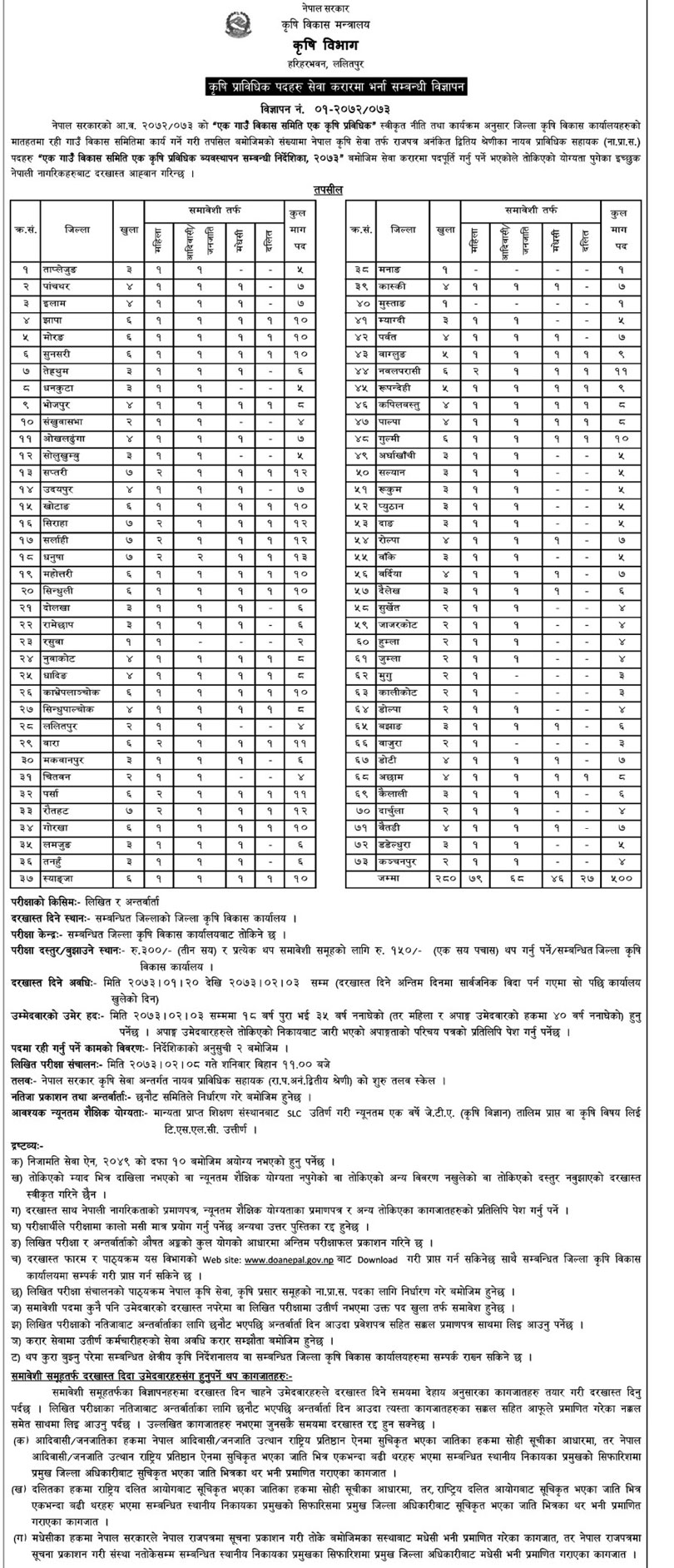सरकारले ‘एक गाउँ, एक कृषि सेवा प्राविधिक’ कार्यविधि अन्तरगत ५ सय जना कृषि सेवाअन्तरगतको कृषि प्राविधिक पदमा दरखास्त आवेदन माग गरेको छ । द्वितीय श्रेणि अन्तरगत नायव प्राविधिक सहायकमा पदमा ५ सय जना माग भएको हो ।