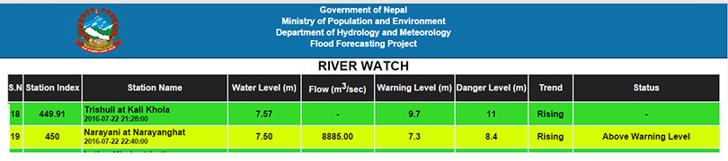 नारायणी नदीमा पानीको सतह ७ दशमबल ३ मिटर पुगेका चेतावनी लेवल मानिन्छ । चेतावनीको संकेत नाघेसंगै नवलपरासीको गण्डक ब्यारेज र त्यस आसपासका क्षेत्रका स्थानीयलाई सतर्क रहन आग्रह गरिएको नवलपरासीका प्रमुख जिल्ला अधिकारी महादेव पन्तले बताए ।