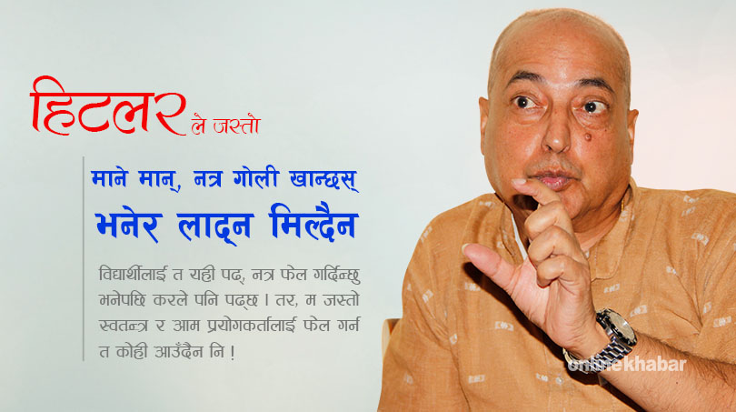 – हो । नत्र चाहिँदै नचाहिएको कुरो किन उठाउनु ? मान्छेहरुले त अहिले ‘विद्यालय’ पनि भन्न छाडिसके, म ‘स्कूल’ जान्छु भन्छन् । यस्तो बेलामा जबर्जस्ती तैंले वि द् या लय नै भन्नुपर्छ भनेर सिकाउनु त कुनै राम्रो शिक्षा होइन । हिटलरको तरिकाले पेल्दै माने मान्, नत्र गोली खान्छस् भने जस्तो कसैलाई लाद्न मिल्दैन ।
