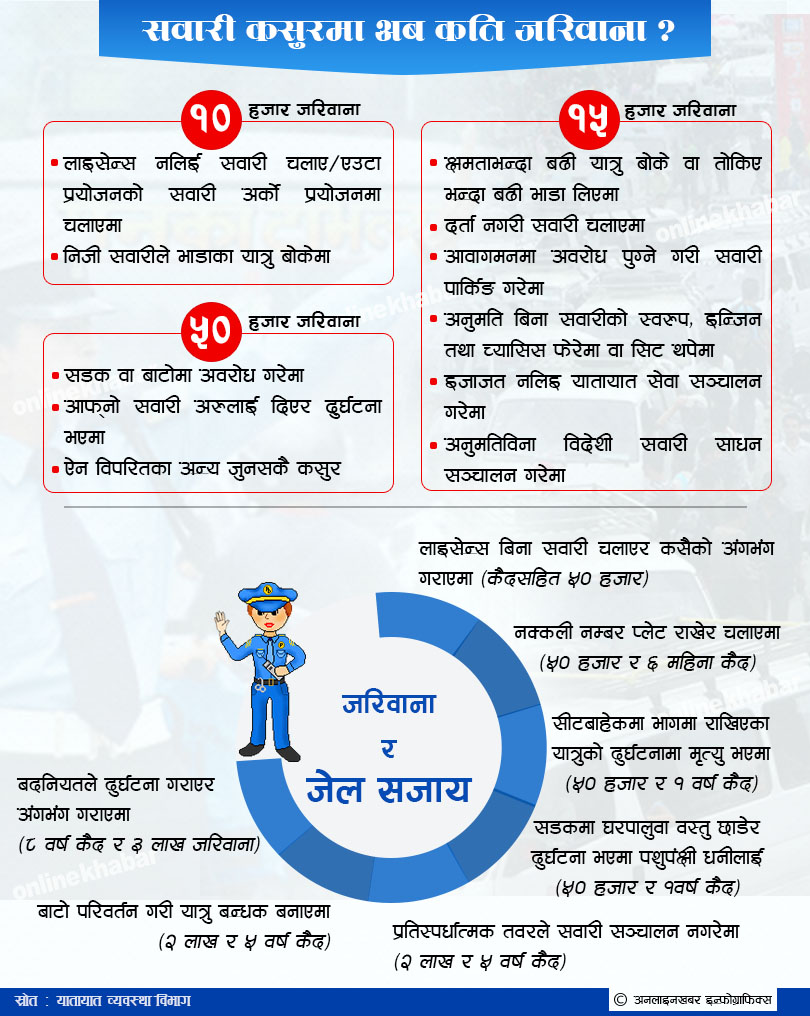 थोरै जरिवाना हुँदा नियम उल्लंघन गरेर सवारी चलाउने र ट्राफिक प्रहरीले भटे जरिवाना तिरेर हिँड्ने प्रचलन बढेको छ । यसलाई मध्यनजर गर्दै सरकारले सवारी तथा यातायात व्यवस्था ऐनमा संशोधन गरी जरिवाना रकम १० हजारदेखि ३ लाख रुपैयाँसम्म पुर्याउने र कैद सजाय गर्न सक्ने व्यवस्था प्रस्ताव गरेको छ ।