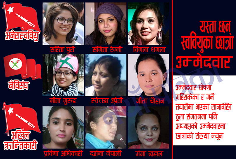 त्यसैगरी पद्मकन्या क्याम्पसमा दन्ता नेपाली (दर्शना) लाई अध्यक्षको उम्मेदवार घोषणा गरेको छ । त्रिविको आंगिक क्याम्पसमध्ये पोखराको पृथ्वी नारायण क्याम्पसमा पनि छात्रालाई अध्यक्षको उम्मेदवार बनाएको छ । पिएनमा प्रबिणा अधिकारी अध्यक्षको उम्मेदवार हुन् ।