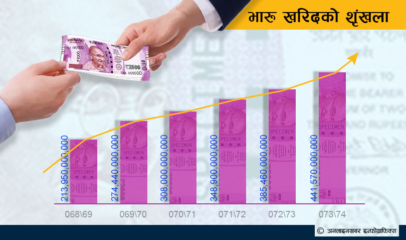 उक्त आँकडा आव ०६८/६९ मा साढे दुई अर्ब हाराहारीमा मात्र थियो । आव ०७२/७३ मा व्यापार घाटाको आकार चार खर्ब ४३ अर्ब थियो भने आव ०७१/७२ मा चार खर्ब ५१ अर्ब ।