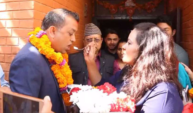 • काठमाडाैं क्षेत्र नम्बर-४ का उम्मेदवार कांग्रेस नेता गगन थापा मनोनयन गर्दा गर्न निस्कनुअघि सगुन ग्रहण गर्दै