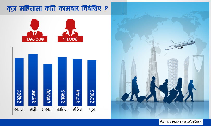 यस वर्ष सबैभन्दा धेरै भदौमा ३३ हजार आठ सय ७८ कामदार बिदेसिएका थिए भने असोजमा सबैभन्दा कम २७ हजार पाँच सय ३५ जना बाहिरिए ।