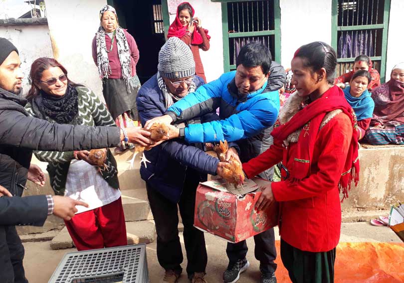 कुखुरा वितरण गर्दै इस्मा गाउँपालिका प्रमुख लक्ष्मण बिष्टले सुआहारा कार्यक्रमले महिला र विपन्न समुदायका लागि खेलेको भुमिका अत्यन्तै महत्पूर्ण भएको बताए ।