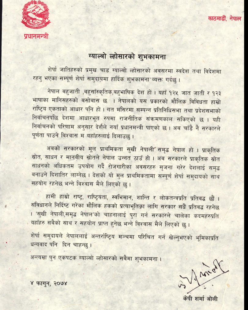 प्रधानमन्त्री ओलीद्वारा ग्याल्बो ल्होसारको शुभकामना