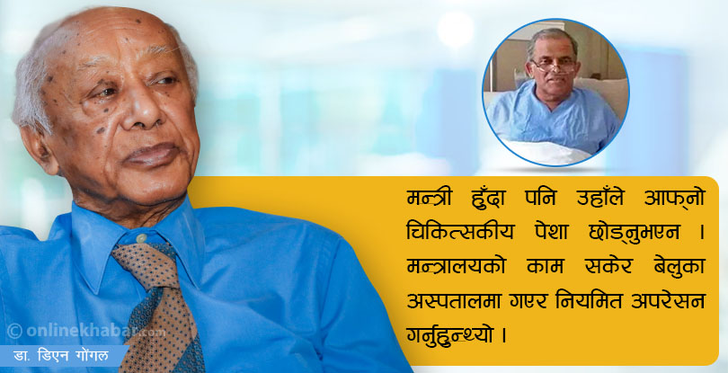 उहाँ हुनुहुन्थ्यो डा. उपेन्द्र देवकोटा । भारतको आसाम मेडिकल कलेजबाट एमबीबीएस पास गरेर उहाँ सन् १९७८ मा नेपाल फर्किनुभएको रहेछ । त्यसपछि केही समय टिचिङ हस्पिटलमा लेक्चररका रुपमा काम गर्नुभएछ । अनि, लोकसेवा पास गरेर वीर हस्पिटलमा छिर्नुभएको रहेछ ।