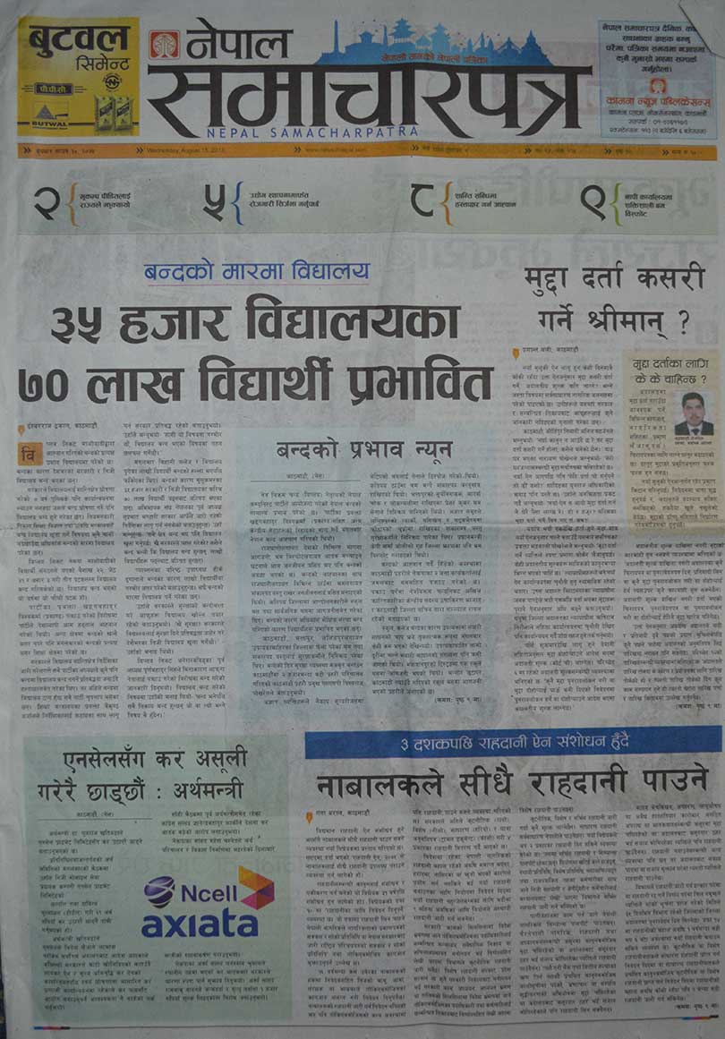 कान्तिपुरले एनसेलको कर असुल्न नयाँ प्रक्रिया शुरु भएको, विषादी मिसिएको पानी पिउँदा विद्यार्थी बिरामी परेकोलगायत समाचार लेखेको छ ।