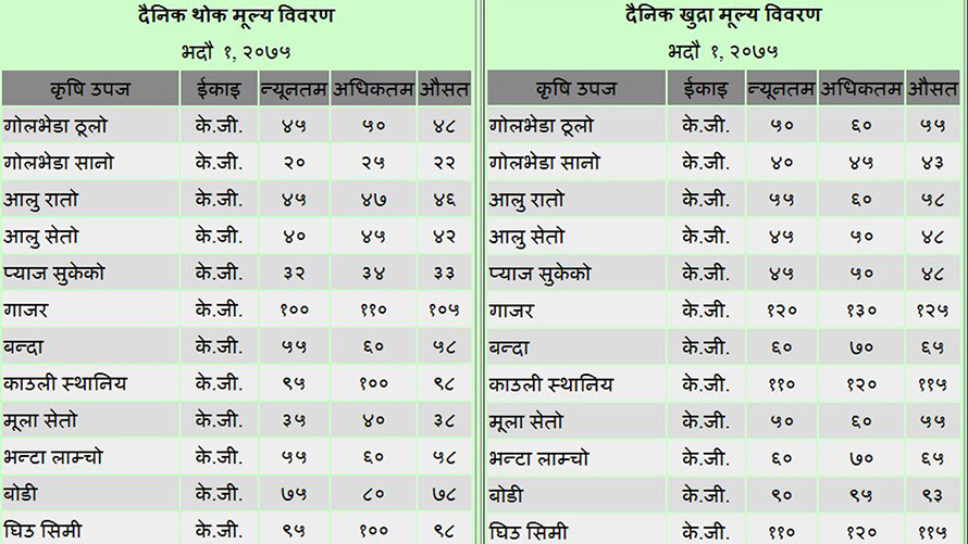 तरकारीको थोक तथा बिक्री मूल्य सूची (बक्समा हेर्नुहोस्)