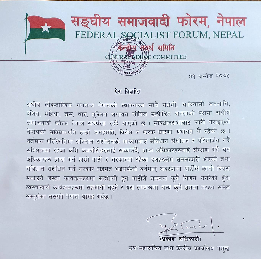 १ असोज, काठमाडौं । संघीय समाजवादी फोरम, नेपालले संविधान दिवसलाई कालो दिवसको रुपमा मनाउने कुनै निर्णय नगरेको स्पष्ट पारेको छ ।