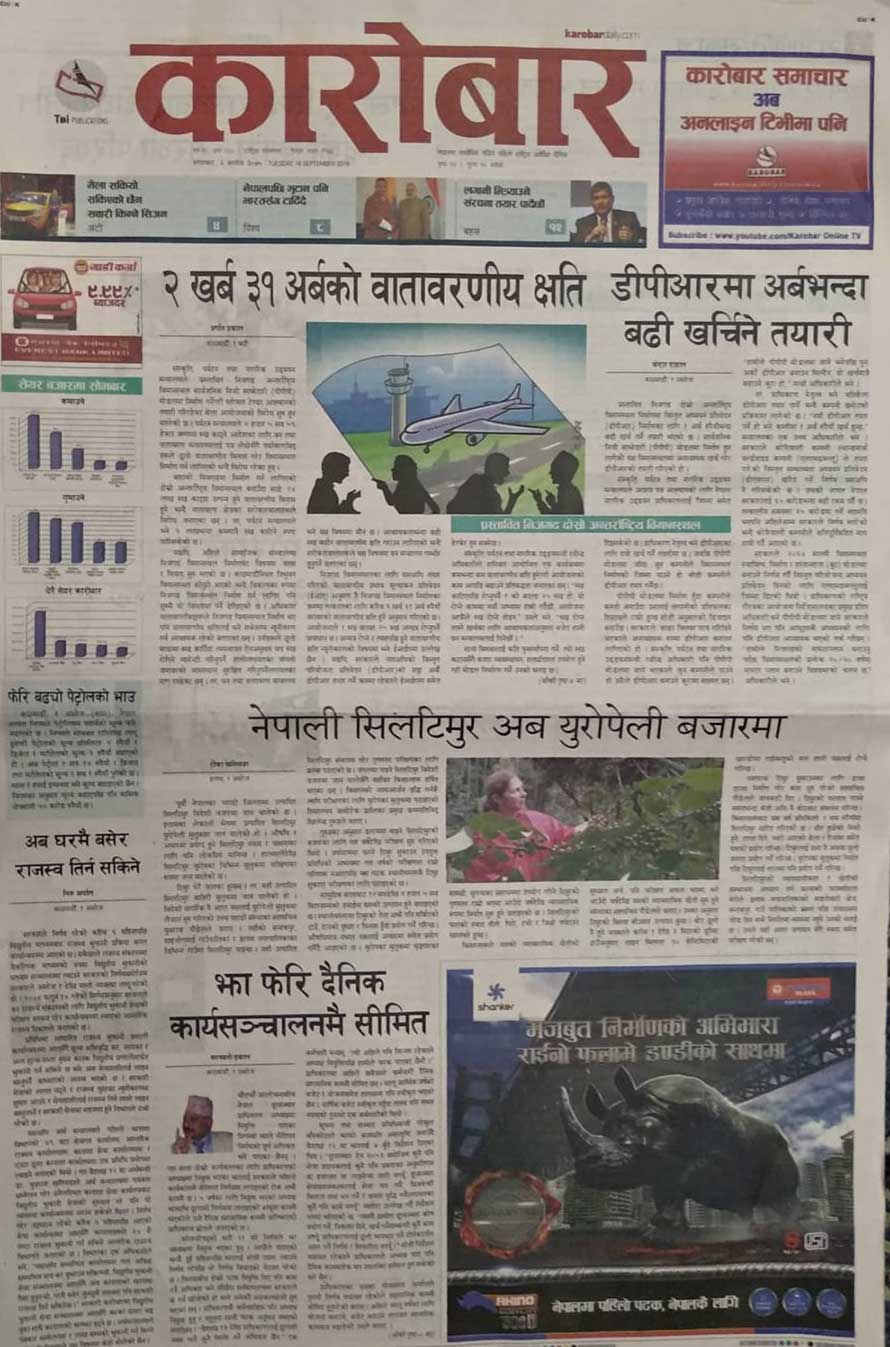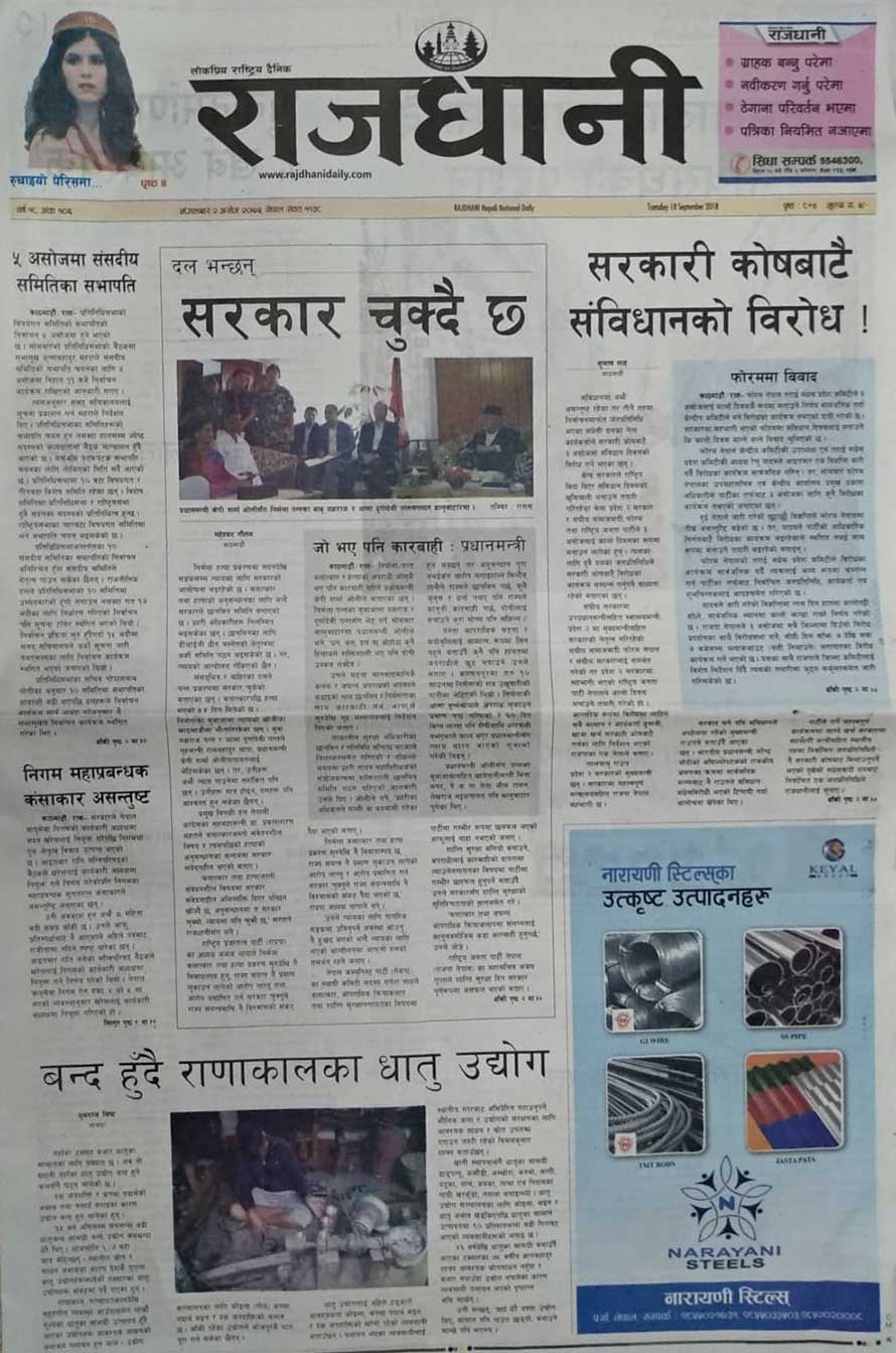 पहिलो पृष्ठमै चिनीमा सरकारले नै सिन्डिकेट लगाएको, सिक्टा सिँचाइ अनियमिततामा अख्तियारले कर्मचारीसँग बयान थालेको, सरकारी कोषबाटै संविधानको विरोध गर्ने तयारी गरिएको, हिंसामा लागेका १ सय ११ समूहको सूची तयार बनेकाे, प्रधानमन्त्रीकै अगाडि बालुवाटारमा भनाभन भएको, राणाकालका धातु उद्योग बन्द हुन थालेकोलगायत समाचार पनि छन् ।