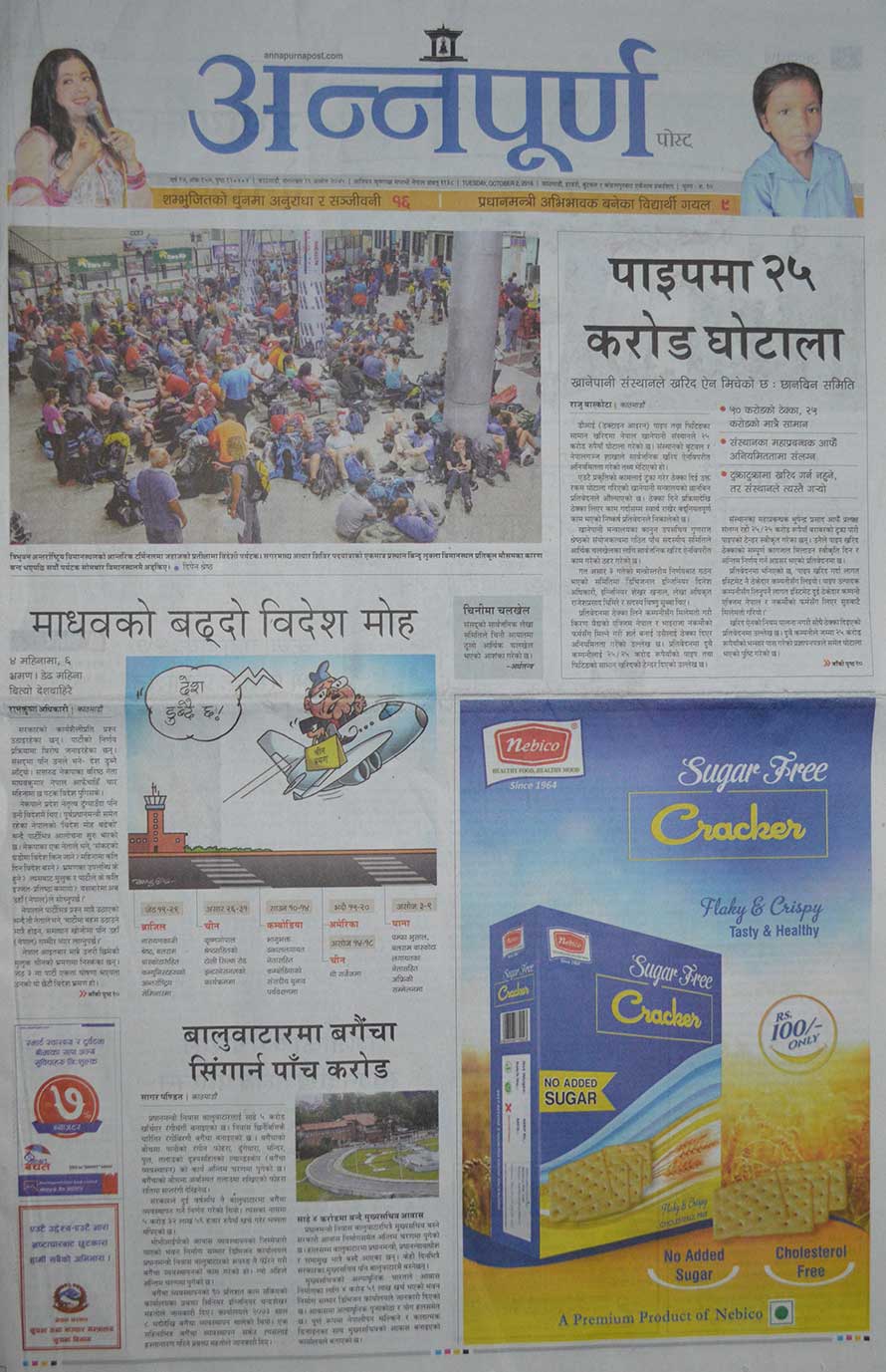 माधव नेपालको बढ्दो विदेश मोहबारे समाचार लेखेको अन्नपूर्णले खानेपानी संस्थानको पाइप खरिदमा २५ करोड घोटाला भएको छापेको छ । समाचार अनुसार खरिद ऐन मिचेर संस्थानले ५० करोडको ठेक्का दिएर २५ करोडको मात्रै पाइप किनेको हो । जसमा संस्थानका महाप्रबन्धक स्वयं संलग्न रहेको समाचारमा उल्लेख छ ।