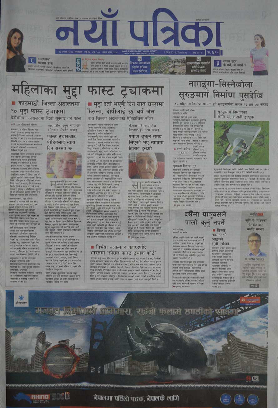 अदालतमा महिला मुद्दाको सुनुवाइबारे मुख्य समाचार लेखेको नयाँ पत्रिकाले नागढुंगा–सिस्नेखोला सुरुङमार्ग निर्माण पुसदेखि हुनेदेखि दशैंमा यात्रुले पालो कुर्नुनपर्ने सम्मका खबर छापेको छ ।