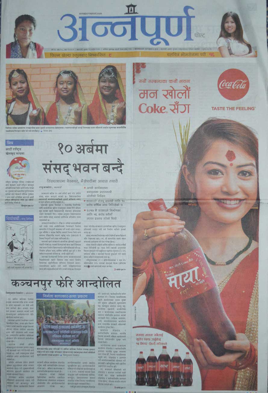 अन्नपूर्णको पहिलो पृष्ठमा १० अर्बमा संसद् भवन बन्न लागेकोदेखि कञ्चनपुुर फेरि आन्दोलित भएकोसम्मका खबर छन् ।
