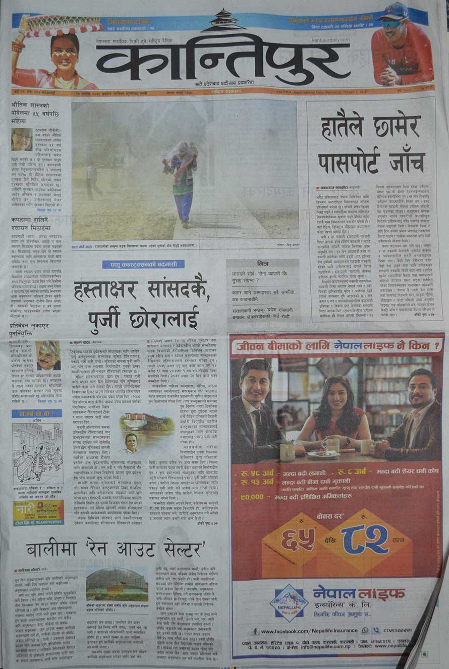 मुख पृष्ठमा काठमाडौंको सडकको दूरावस्था झल्काउने तस्वीर छापेको कान्तिपुरले त्रिभुवन अन्तर्राष्ट्रिय विमानस्थल (टीअार्इए) ले प्रयोग गर्ने प्रविधिबारे चर्चा गरेको छ । समाचार अनुसार प्रविधि नहुँदा हातैले छामेर पासपोर्ट जाँच गर्ने गरिएको छ ।