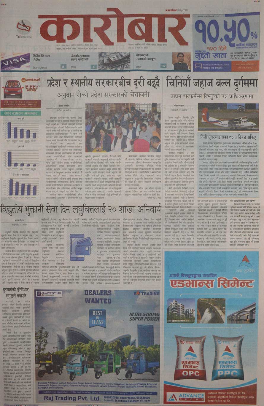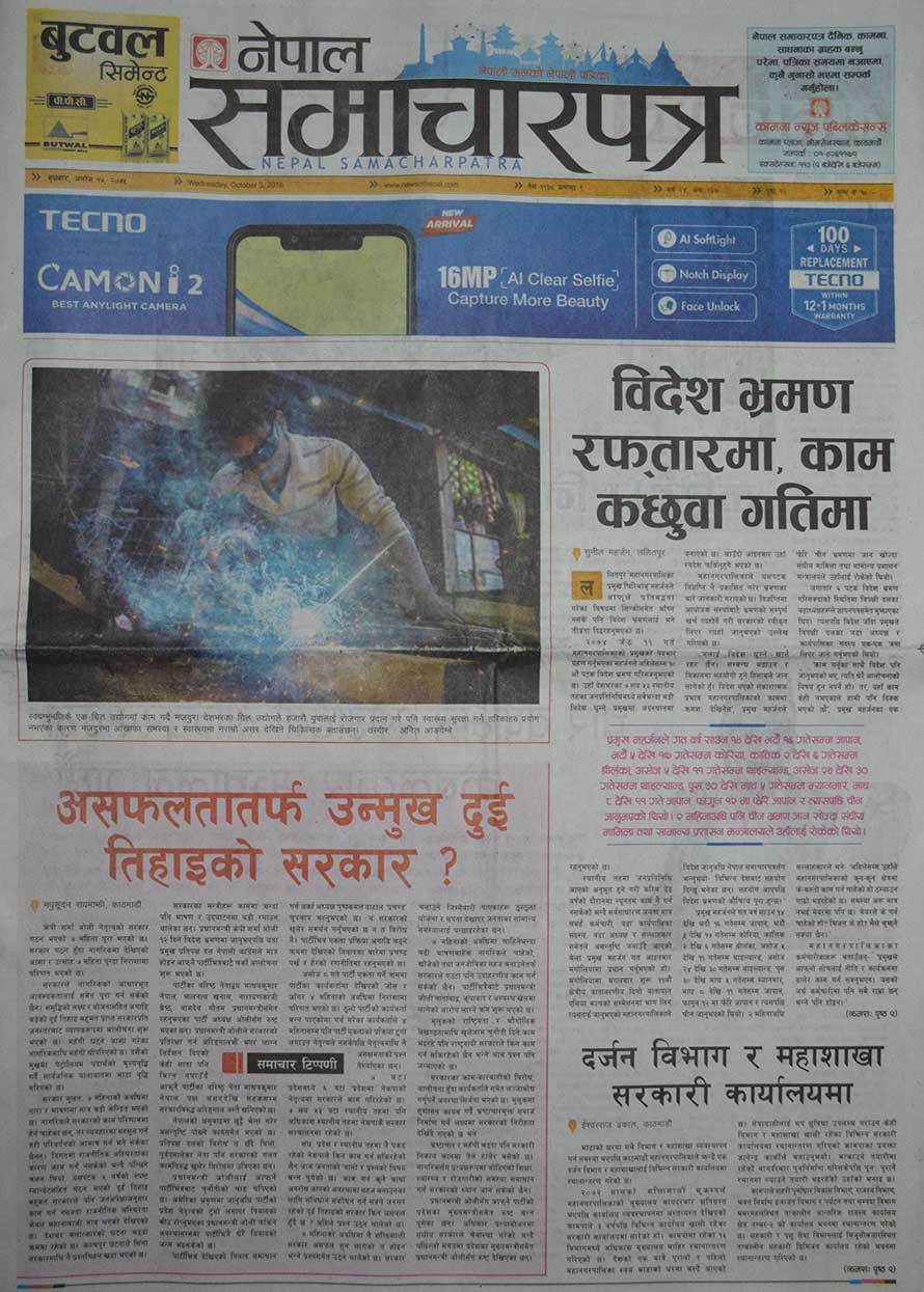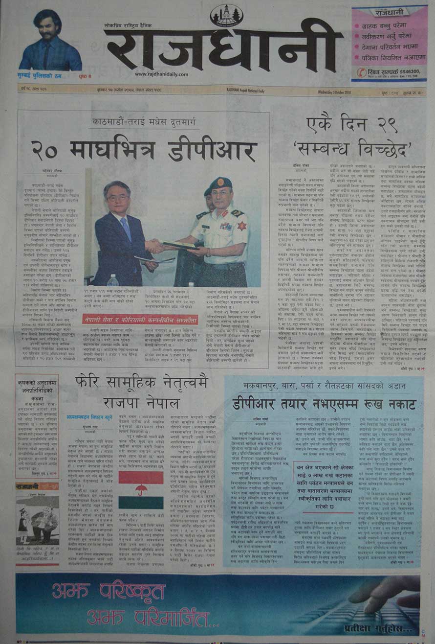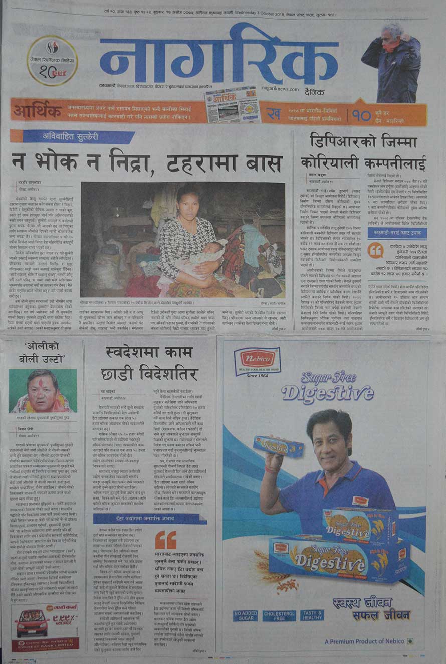 अविवाहित सुत्केरीको टिठलाग्दो कथा लेखेको नागरिकले काठमाडौं–फास्ट ट्रयकको डीपीआर निर्माण जिम्मा कोरियाली कम्पनीलाई दिइएको, इँटा उद्योगमा जनशक्ति अभाव भएकोलगायत समाचार छापेकाे छ ।