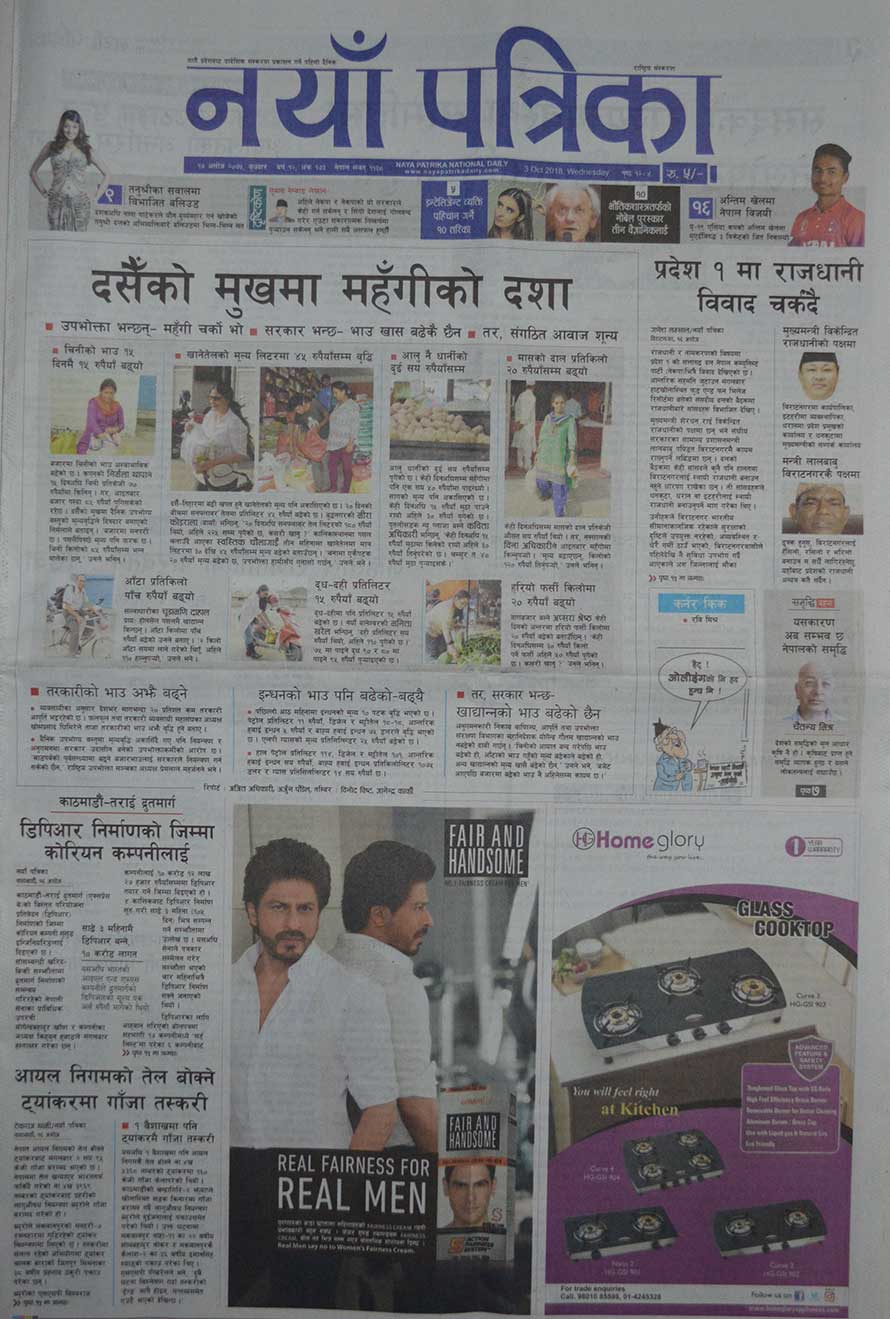 नयाँ पत्रिका दैनिकले महँगीबारे मुख्य समाचार लेखेको छ । उपभोक्ता चर्को मूल्यको मारमा परे पनि सरकार भने मूल्यवृद्धि भएको मान्न तयार छैन । अनुगमनकारी निकाय वाणिज्य, आपूर्ति तथा उपभोक्ता संरक्षण विभागका महानिर्देशक योगेन्द्र गौतमले नयाँ पत्रिकासँग खाद्यान्नको भाउ नबढेको दाबी गरेका छन् ।