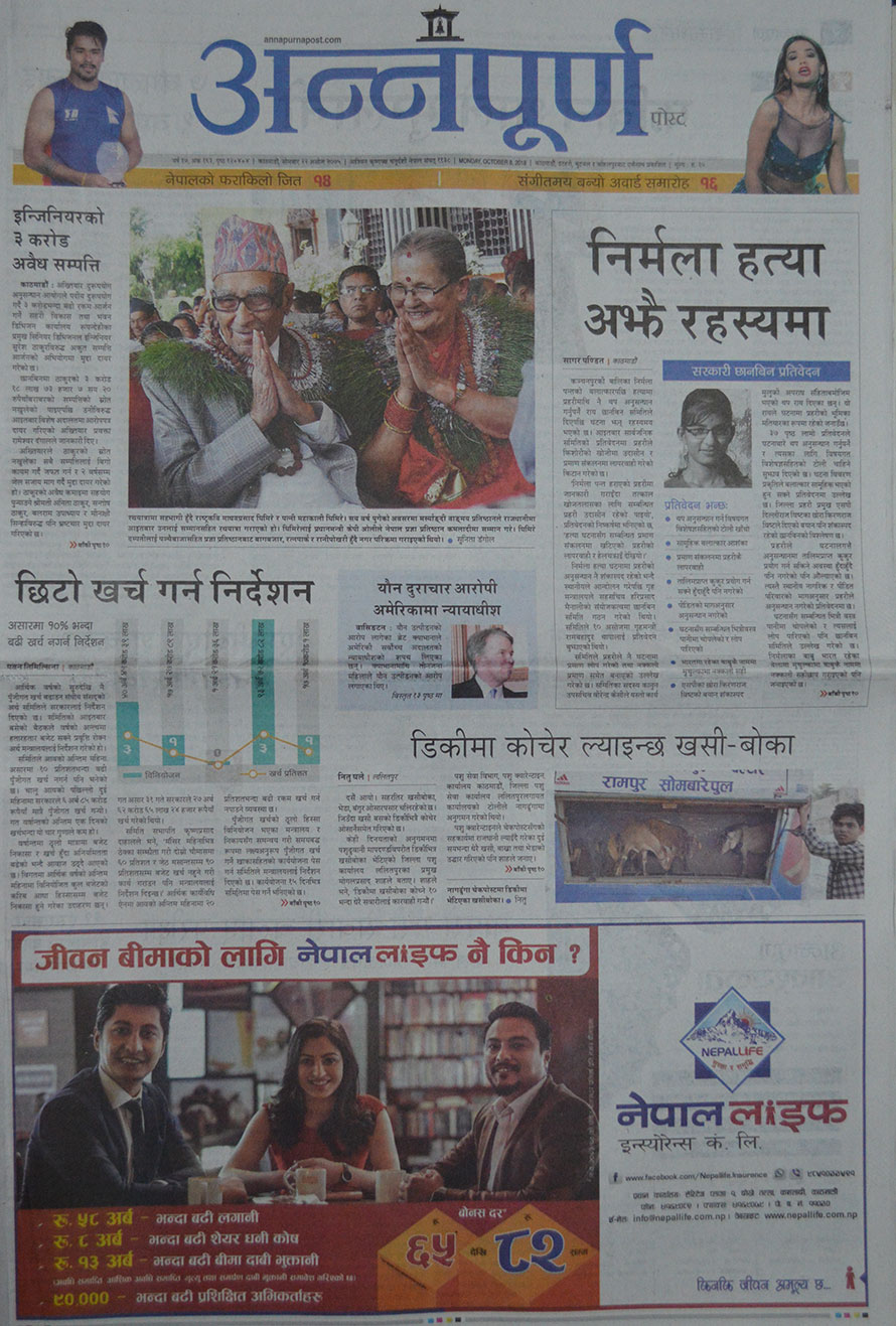 २२ असोज, काठमाडौं । राजधानीबाट आज प्रकाशित सबै राष्ट्रिय दैनिक पत्रिकाहरुको पहिलो प्राथमिकतामा आइतबार सार्वजनिक निर्मला हत्या छानबिन प्रतिवेदन परेको छ । प्रतिवेदनले कञ्चनपुरको भीमदत्त नगरपालिका–२, उल्टाखामकी १३ वर्षीया निर्मला पन्तको बलात्कारपछि हत्या भएको घटनामा प्रहरीको लापरबाही र हेलचेक्रयाँइ देखिएको औंल्याएको छ ।