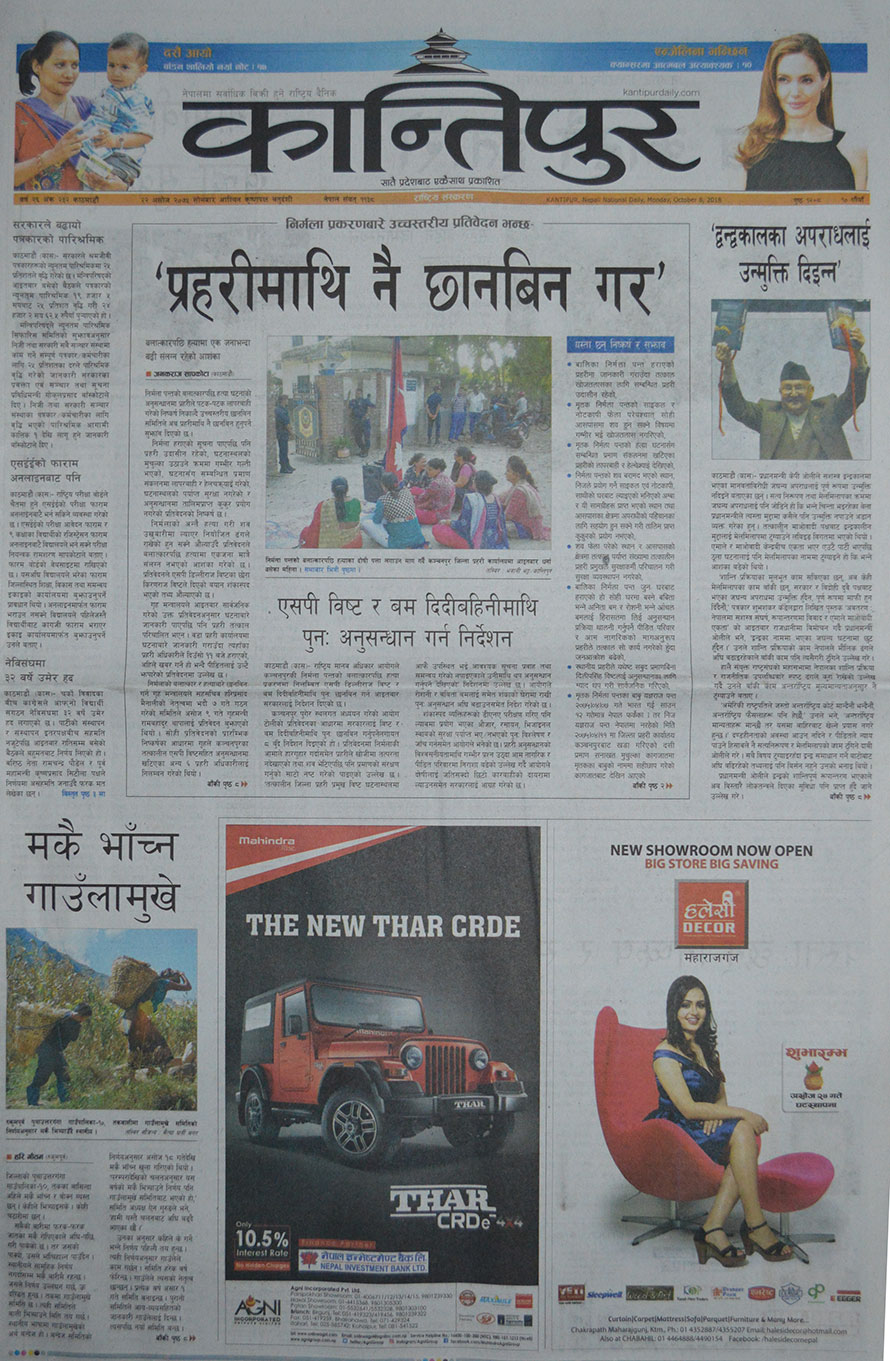 कान्तिपुरले ‘प्रहरीमाथि नै छानबिन गर’ शीर्षक दिएर निर्मला पन्त हत्याको छानबिन गर्न गठित समितिले सार्वजनिक गरेको प्रतिवेदनमाथि टेकेर मुख्य समाचार लेखेको छ । द्वन्द्वकालका अपराधलाई उन्मुक्ति दिनुहुन्न भनेर प्रधानमन्त्रीले व्यक्त गरेको भनाइलाई पनि कान्तिपुरले पहिलो पृष्ठमा लेखेको छ ।